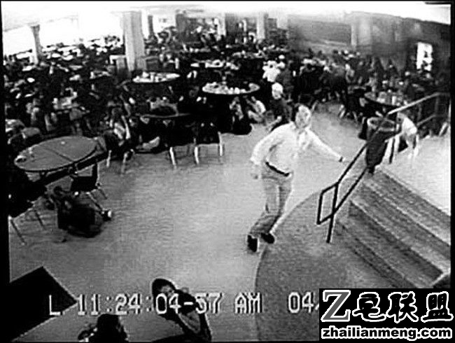 6.哥伦比亚高中的教练威廉·戴夫·桑德斯(William“Dave”Sanders)在学校的安全摄像机上可以看到被捕,就在被枪杀身亡之前,有100多名学生从食堂里出来。