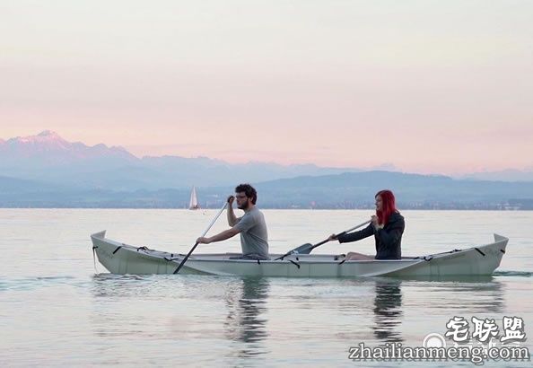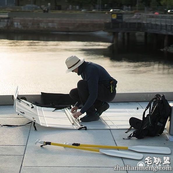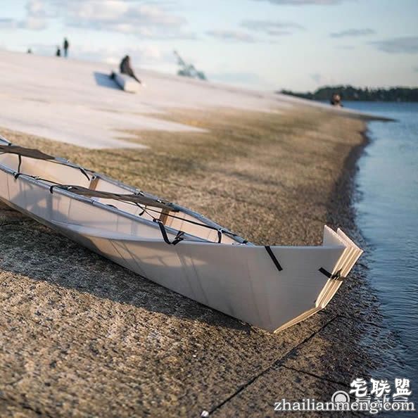 这艘船的设计概念来自折纸,船身原本只是块长方形的板子,通过折叠、运用绳子固定,便能组成长180公分、宽40公分、深25公分的独木舟。