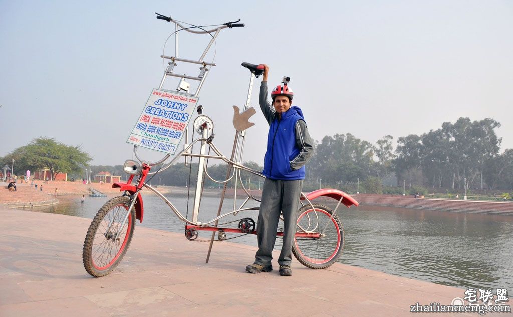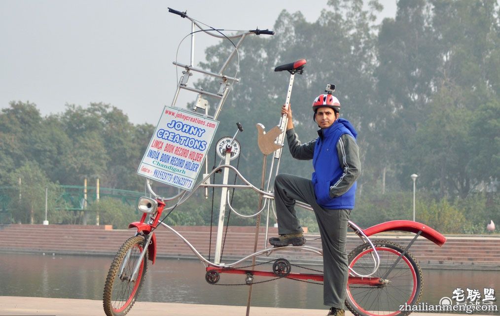 ajivKumar来自昌迪加尔,自己设计2.5米高自行车,伸展开长度是3米多。