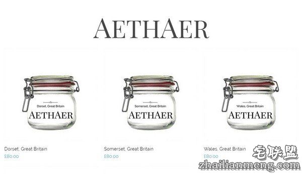 Aethaer空气公司由李奥德瓦兹(Leo De Watts)创立,在英国多塞特、萨默塞特、威尔斯、威尔特和约克郡地区的野外收集,它们用特殊的网子蒐集空气,强调能留住「田野的气息」,并由玻璃的密封罐装入空气贩售。
