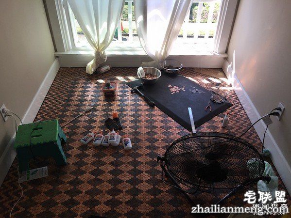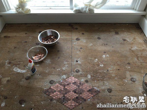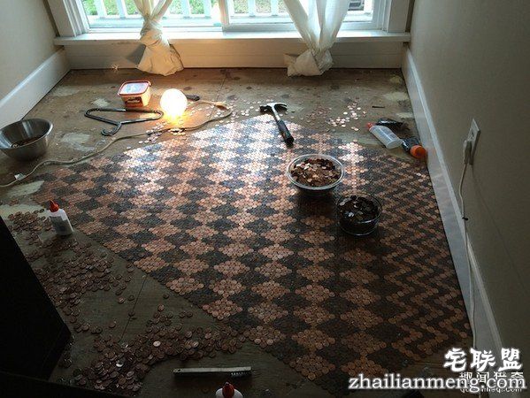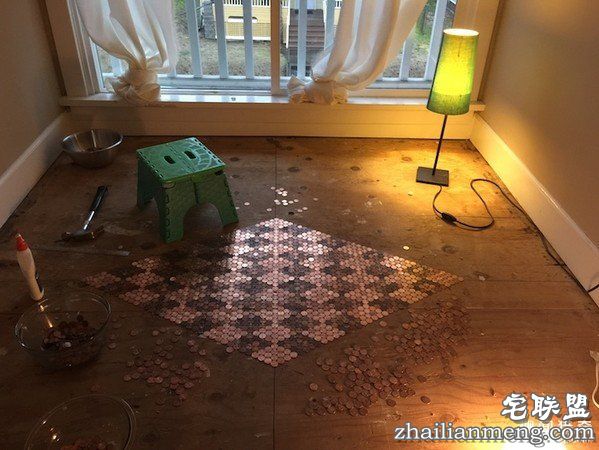 用硬币铺地板,是这样做的,她先测量空间大小、准备3大袋的1分钱、10罐胶水,接下来要把钱币分成亮的、不亮的,才能排出图案,是不是相当聪明,然后找出地板的中心,往外开始排出一个亮、一个暗,相连的菱形,仔细地黏牢。