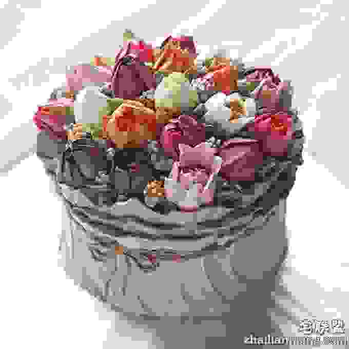 白白的奶油上边,或姹紫嫣红一片,或绿叶葱葱生机盎然。