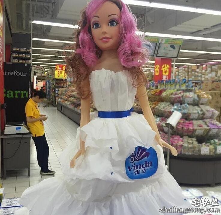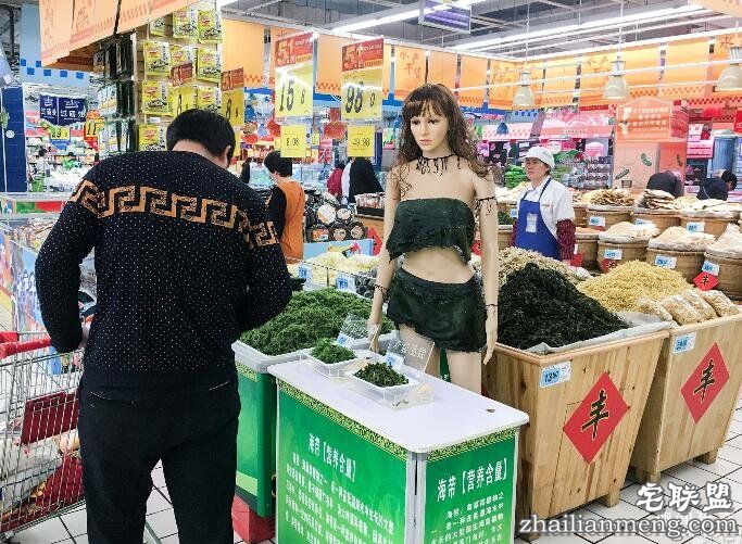 2017年4月21日,浙江省绍兴市上虞区一超市内, “超市大妈”再出神作,别出心裁地以海带为衣穿在展示模特上