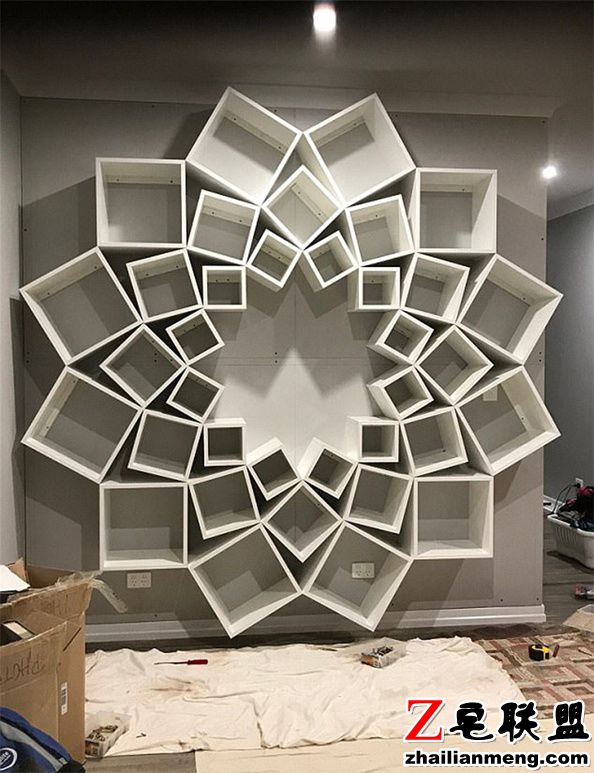 整个过程从早上8点开始,直到晚上12点才结束,总共花上16小时,在墙壁上打造出巨大花形书架。