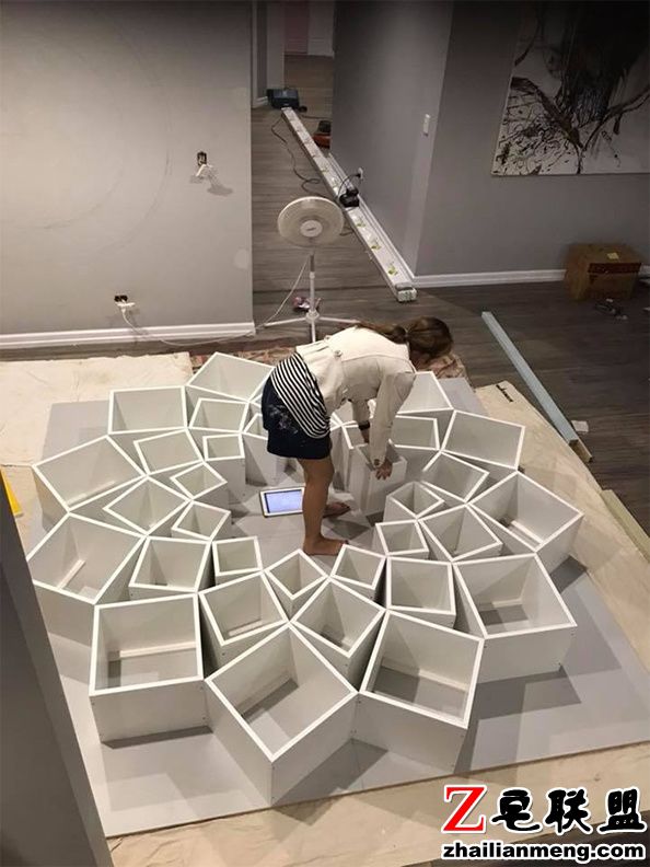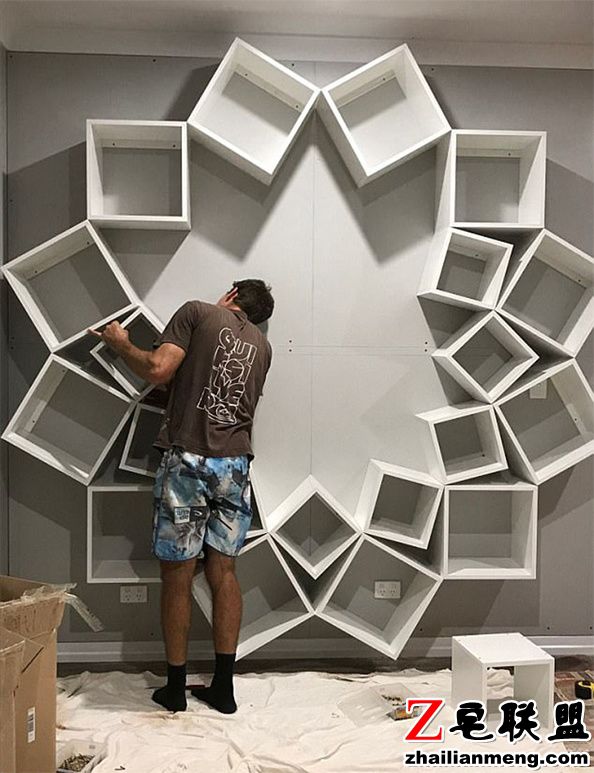 先将白色木板在地上排列出理想的设计,接着才一个个钉到墙上。